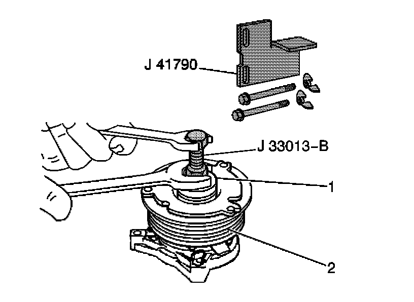 NOTE: Do not drive or pound on the clutch hub or shaft. Internal damage to the compressor may result. The forcing tip on the J 33013-B remover/installer center screw must be flat or the end of the shaft/axial plate assembly will be damaged.