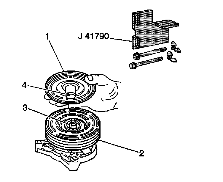 5. Place the clutch plate and the hub assembly (1) onto the compressor shaft.