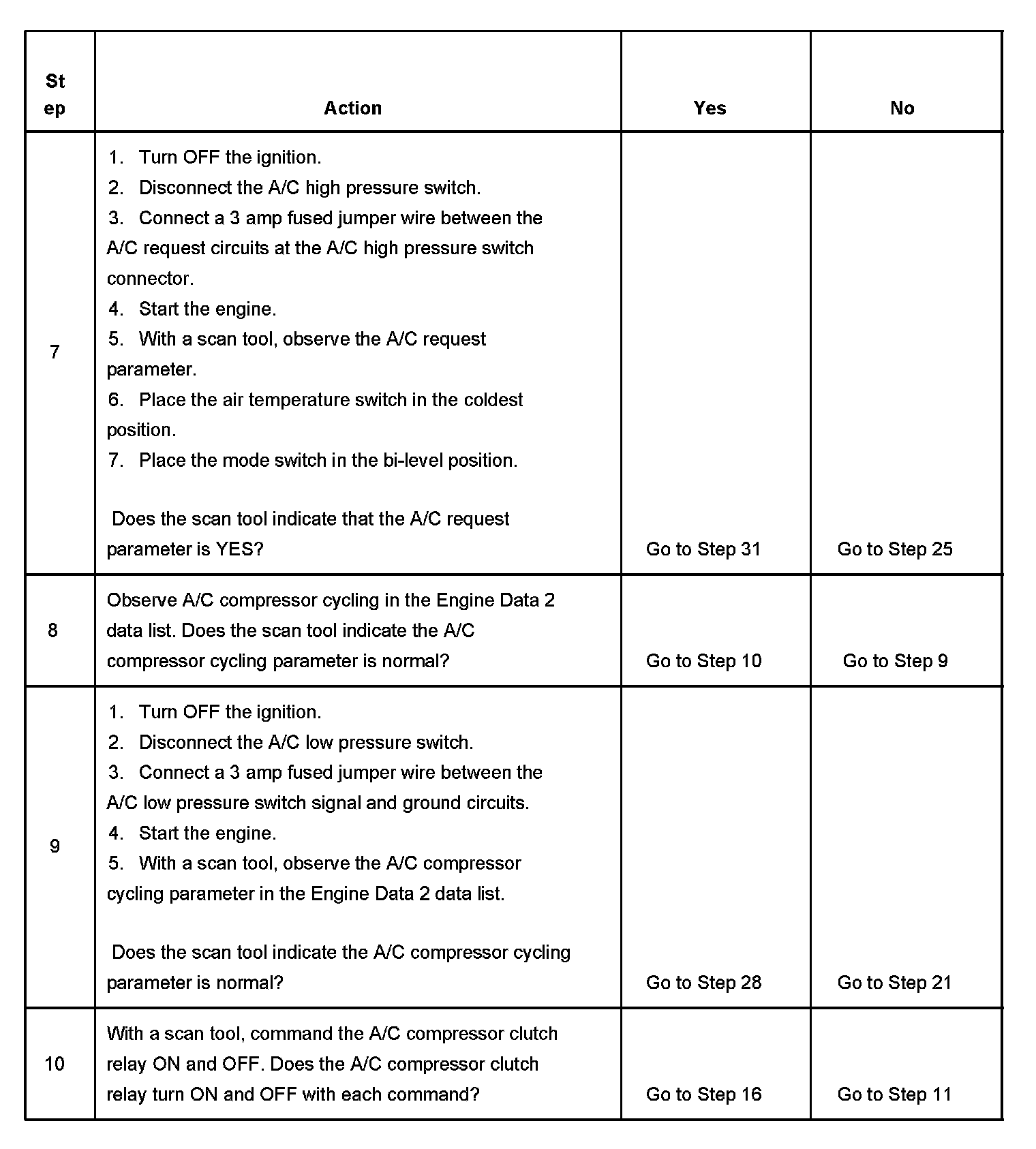 8. The scan tool checks the function of the A/C low pressure switch through the A/C compressor cycling data.