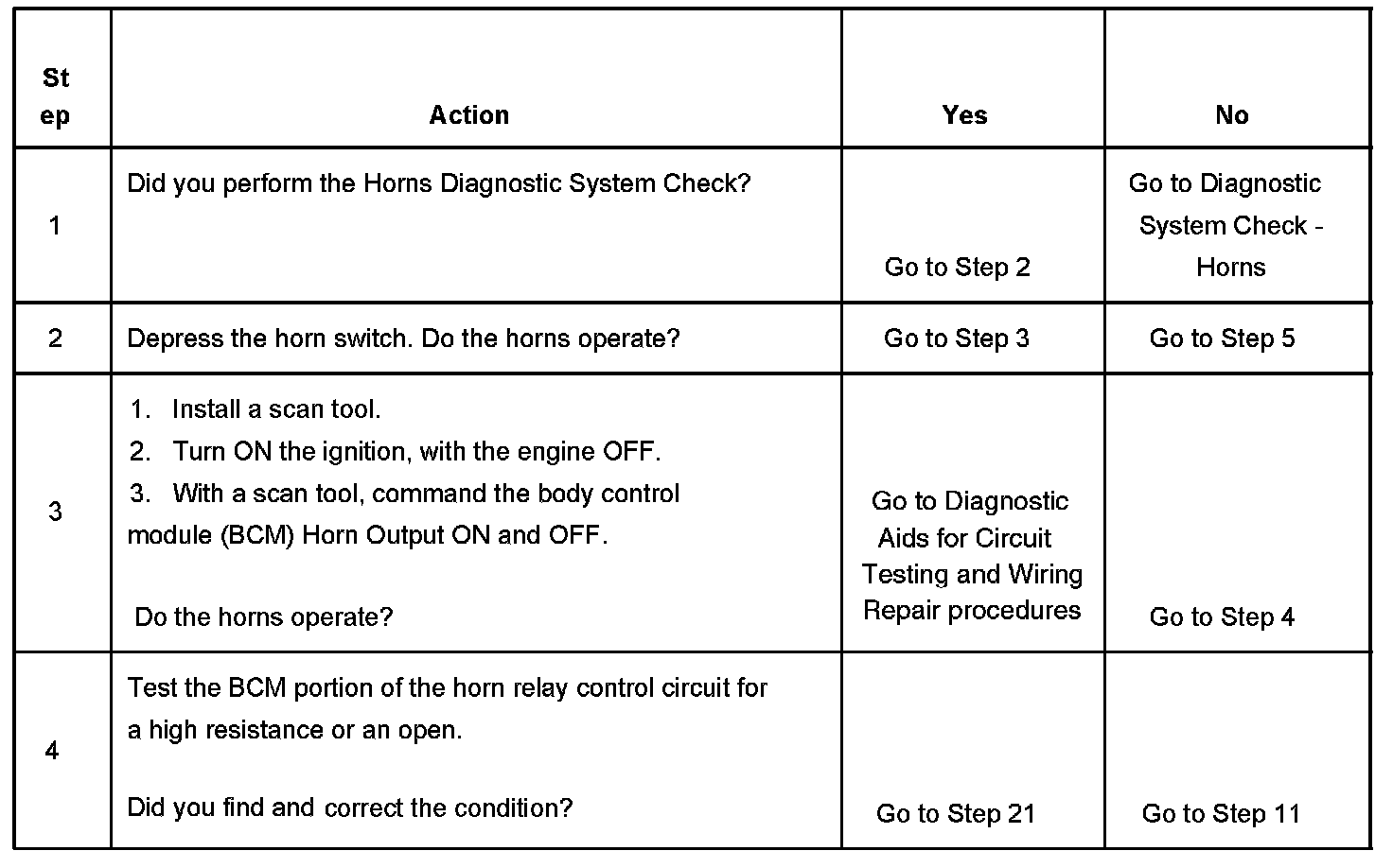 4. Verifies that the body control module (BCM) is providing ground to the horn relay.