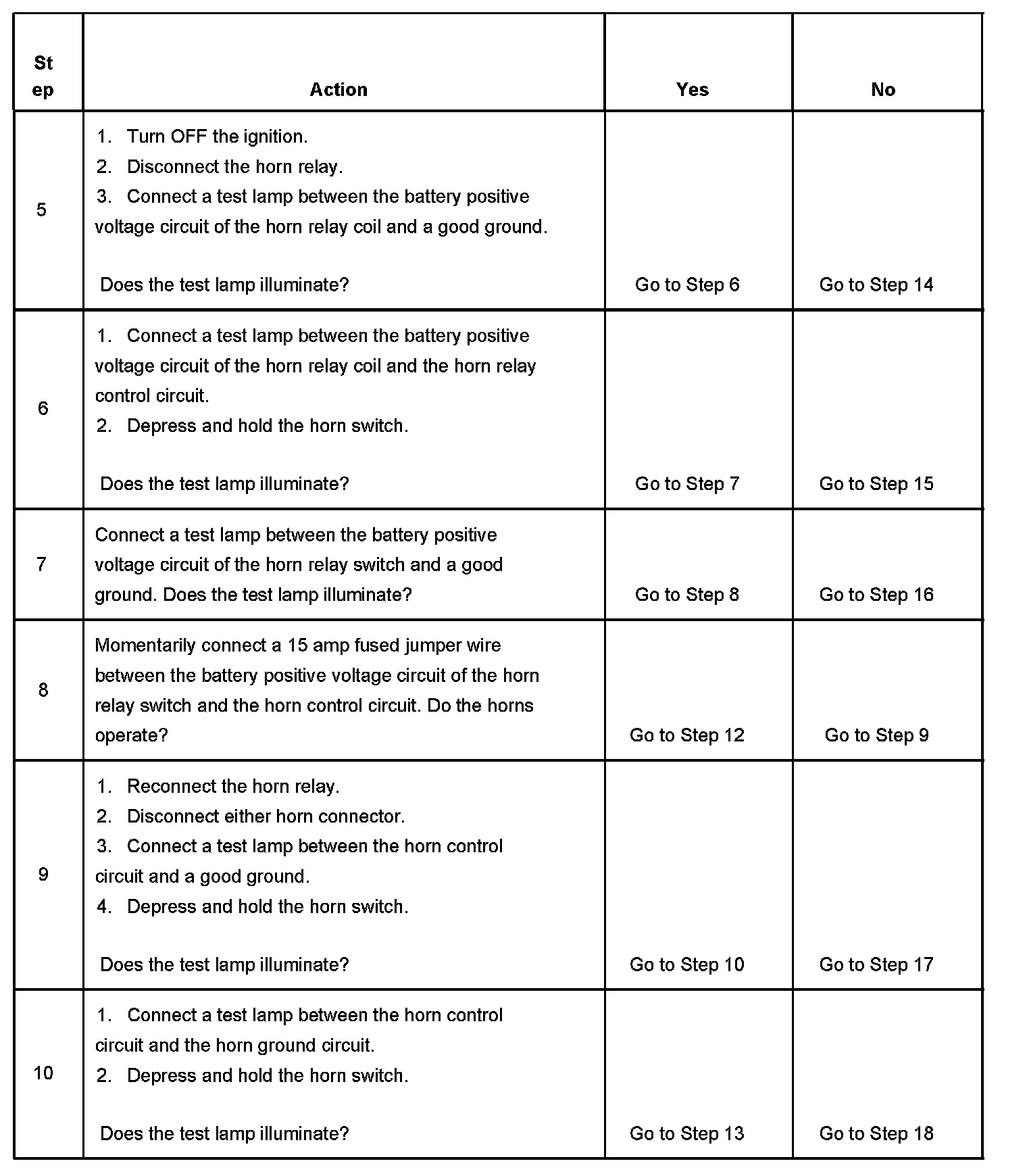 5. Tests for voltage at the battery positive voltage terminal of the horn relay coil.