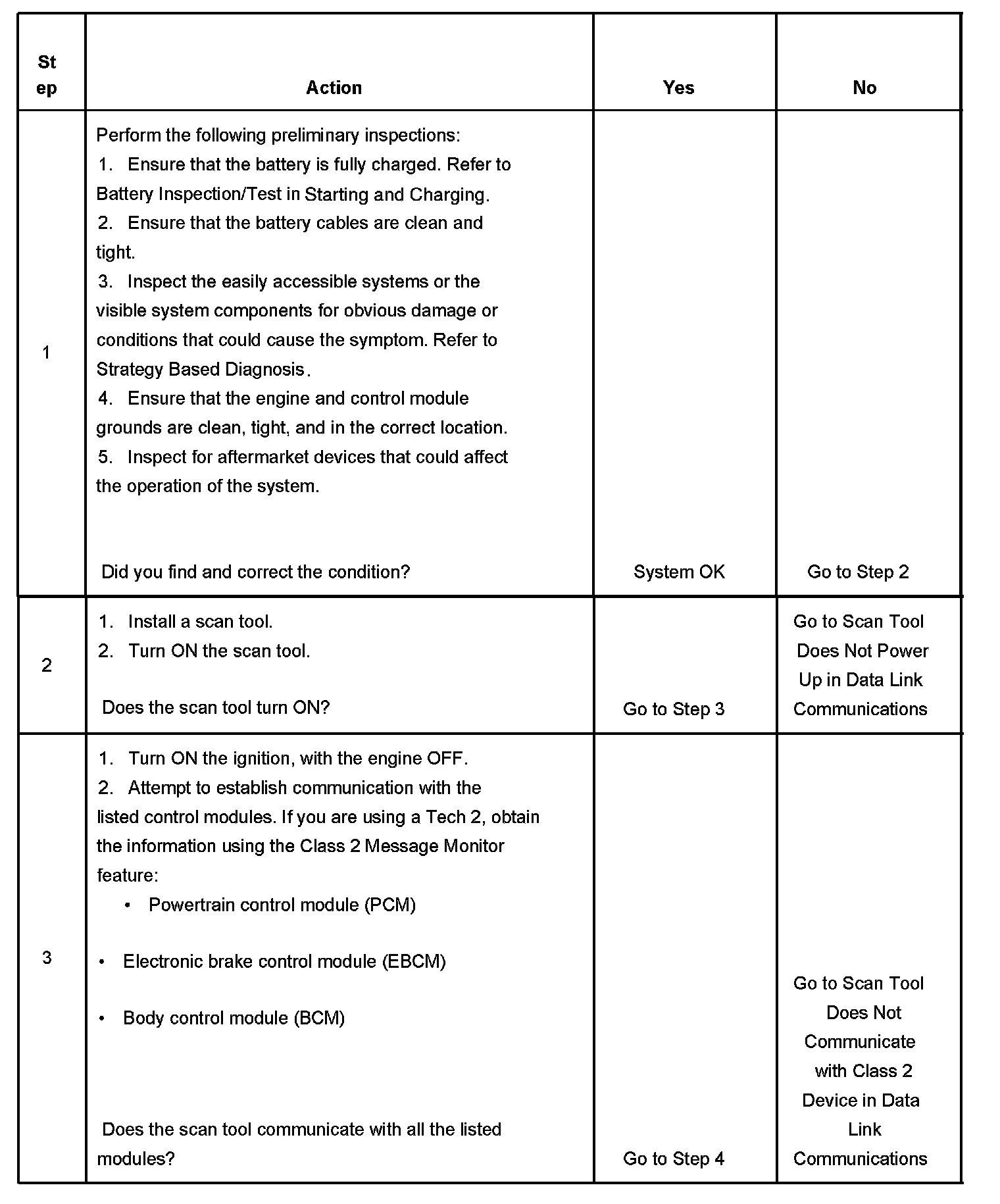The Diagnostic System Check is an organized approach to identifying a condition created by an electronic engine control system malfunction. The Diagnostic System Check must be the starting point for any driveability concern. The Diagnostic System Check directs the service technician to the next logical step in diagnosing the concern. Understanding the table and using the table correctly reduces diagnostic time and prevents the replacement of good pans.