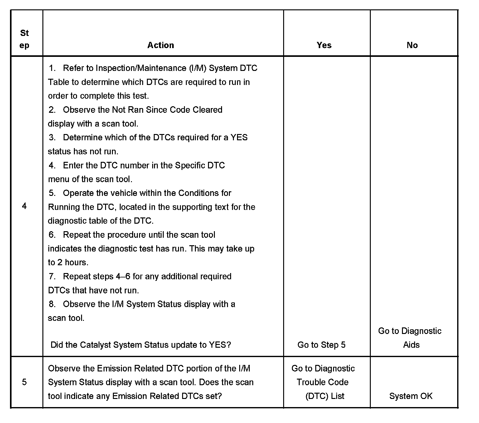 The control module runs a maximum of 6 tests per trip until the Catalyst System Status updates to YES. If the status does not update, the test outlined in this procedure can be repeated until the I/M System Status updates to YES.