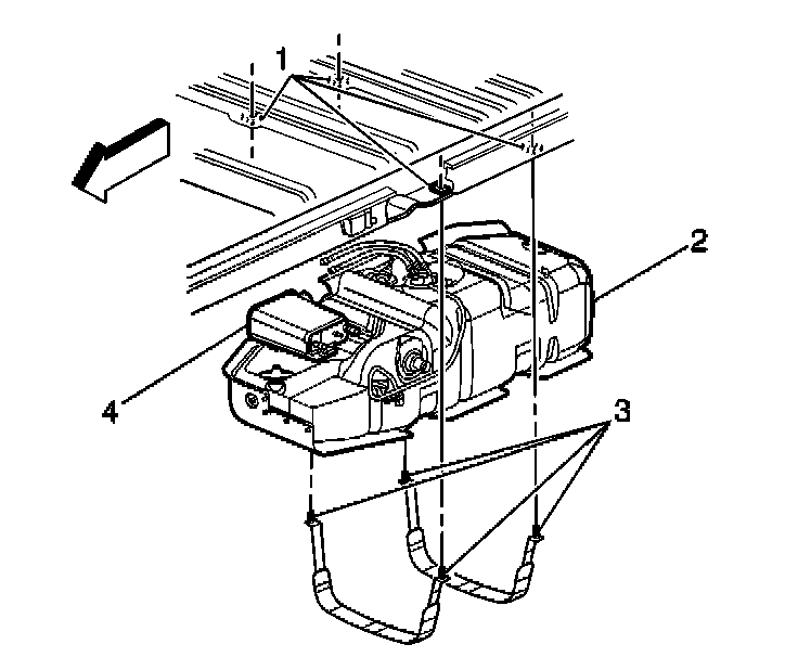 NOTE: Tighten the strap fasteners by steps, alternating between the fasteners, until the specified torque is reached. A failure to tighten the strap fasteners as specified will cause the bottom of the tank to flex upward. This will result in the fuel gauge indicating that there is fuel remaining in the tank when the tank is empty.