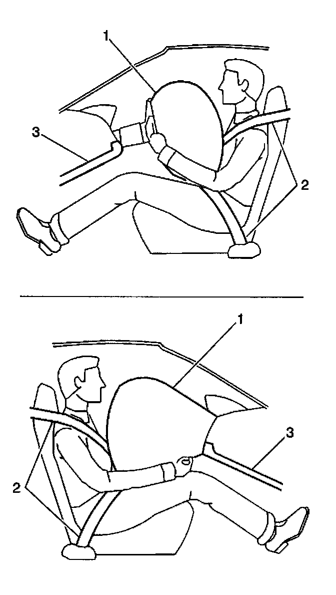 The supplemental inflatable restraint (SIR) system supplements the protection offered by the occupant's seat belt system (2). The SIR system may contain several inflator modules located throughout the vehicle, i.e. steering wheel module (1), and instrument panel (IP) module (1). Each inflator module has a deployment loop that is controlled by the sensing and diagnostic module (SDM) mounted inside the vehicle. The SDM determines the severity of a collision with the assistance of various sensor inputs. When the SDM detects a collision of sufficient force it will process the information provided by the sensors to further support air bag deployment. The SDM performs continuous diagnostic monitoring of the SIR system electrical components. Upon detection of a circuit malfunction, the SDM will set a DTC and inform the driver by turning the AIR BAG indicator ON. The steering column (1) and knee bolsters (3) are designed to absorb energy and compress during frontal collisions in order to limit leg movement and decrease the chance of injury to the driver and passenger.