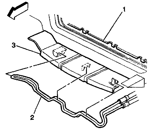 2. Install the power steering cooler pipe (2) to the air baffle (3).