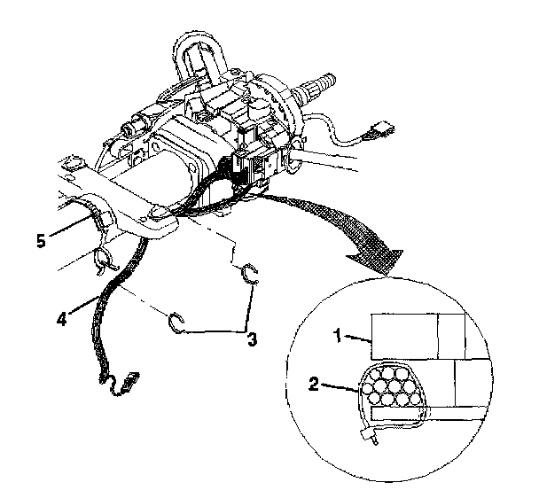 5. Remove the steering column wire harness (1) from the steering column and the wire harness strap (2).