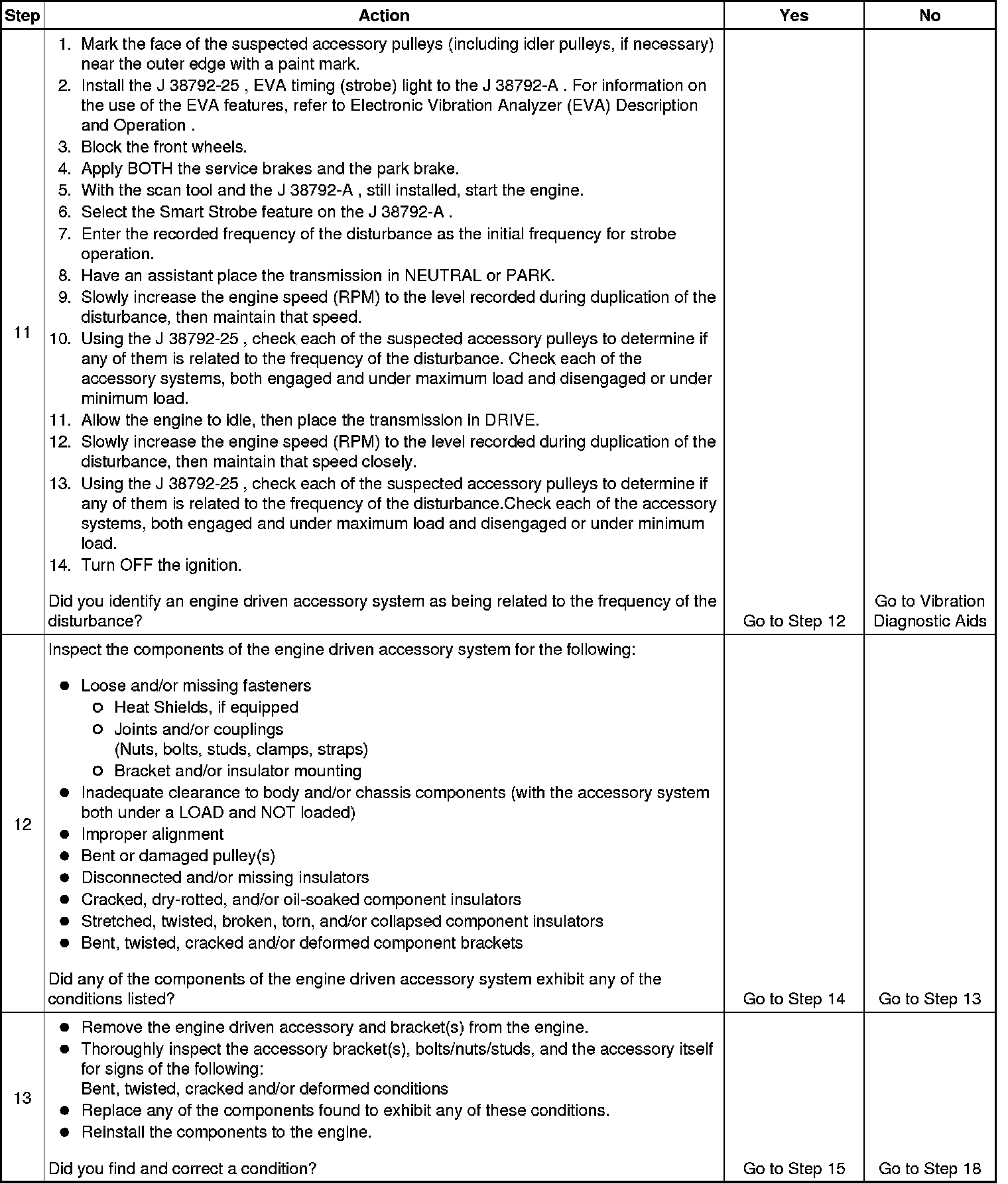 10. Non-rotating engine driven accessory components can no longer produce a unique disturbance. If a disturbance is still present, but the characteristics have been altered, it is possible that these component systems are acting as a transfer path for engine firing frequency or a first order engine disturbance.