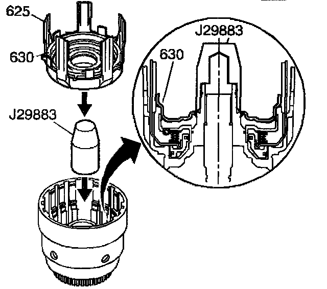 Important: The forward clutch piston (630) apply legs must be indexed with the 3rd and 4th clutch apply ring (625) legs.