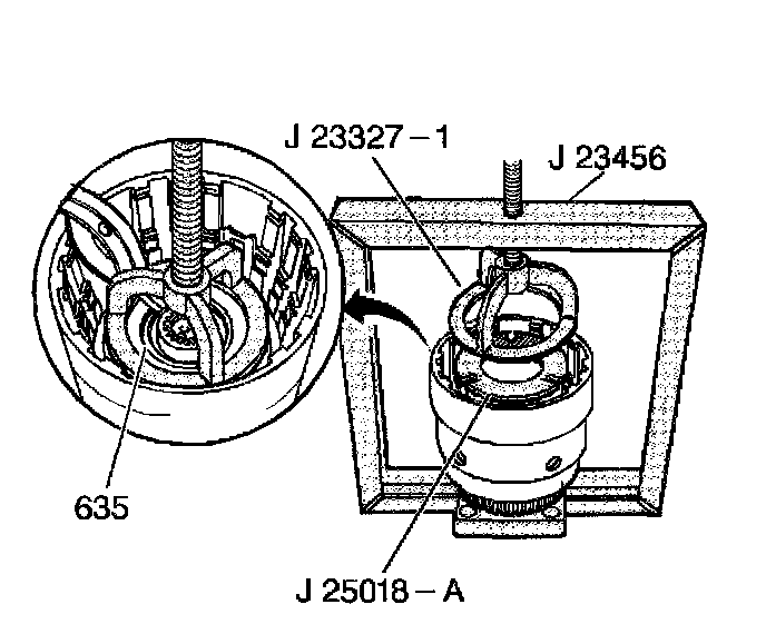 18. Install the J 23327-1 and the J 25018-A, and compress the overrun clutch spring assembly using J 23456.