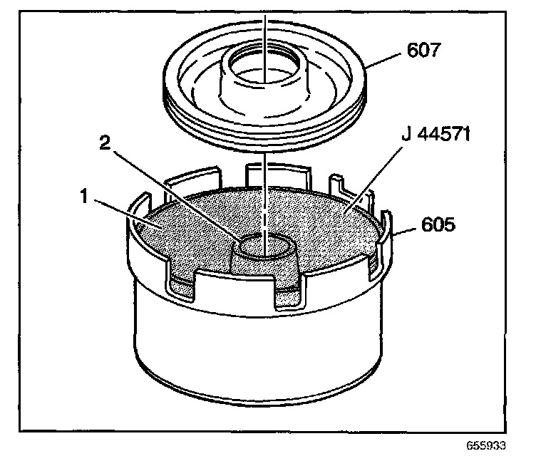 3. Install the J44571 inner (2) and outer (1) reverse input clutch piston installer.