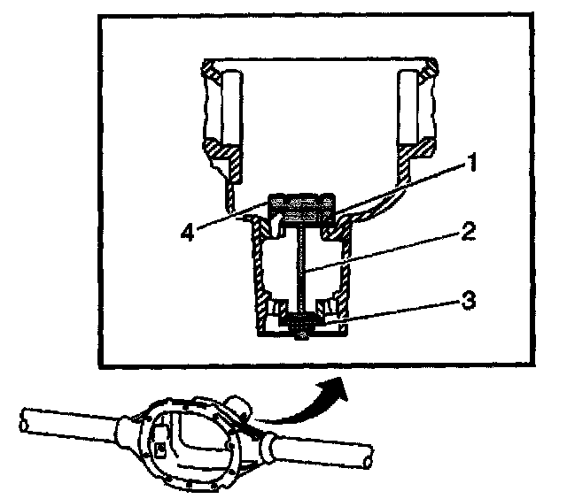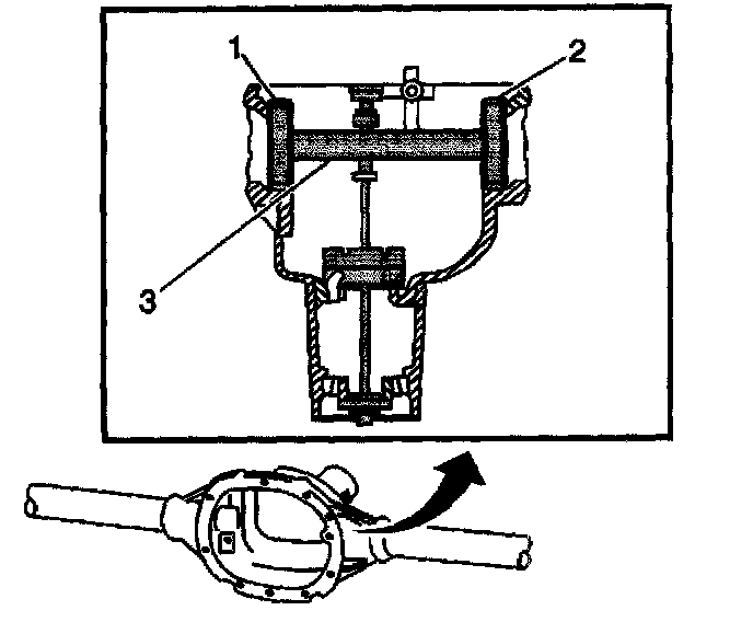 6. Assemble the J 21777-45 (1, 2) to the J 23597-1 (3) and install into the differential carrier bore of the axle housing as shown.