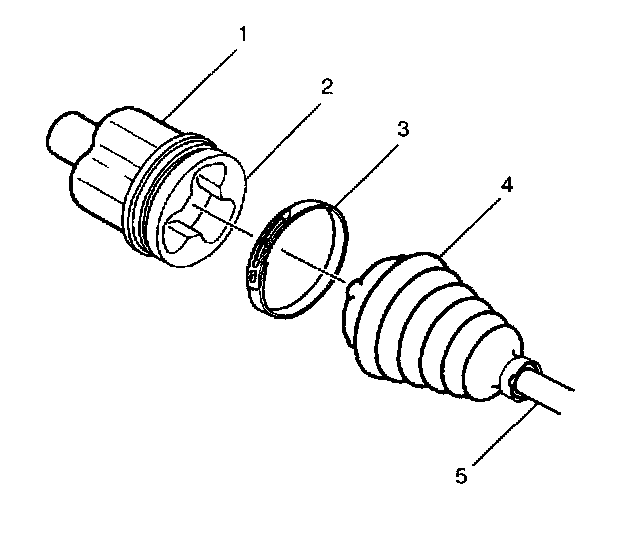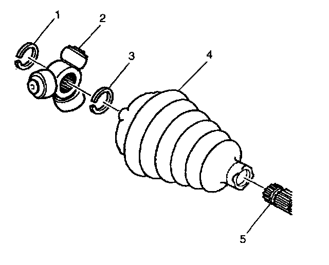 2. Remove the tripot housing (1) and bushing (2) from the halfshaft bar (5). Wipe the grease off of the tripot assembly roller bearings and housing.