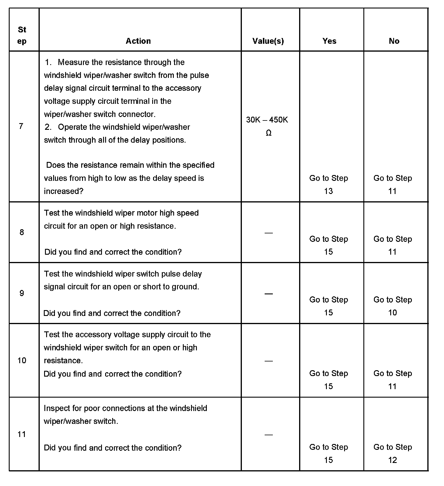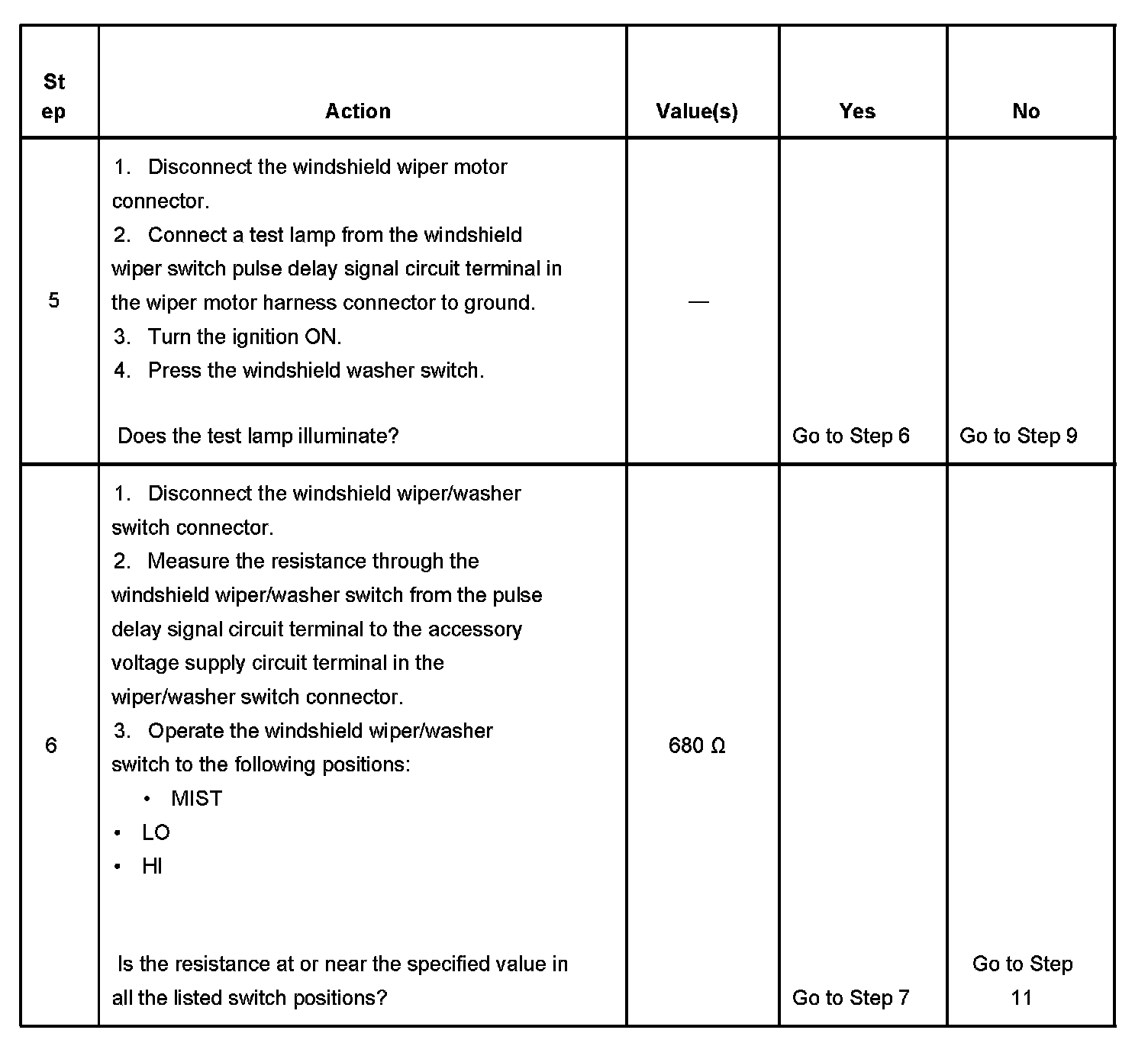 7. This step tests for continuity through the delay resistors in the windshield wiper/washer switch. The measured resistance will change in sequence from high to low as the delay speed is increased. The connector behind the instrument panel knee bolster is suitable for performing this step.