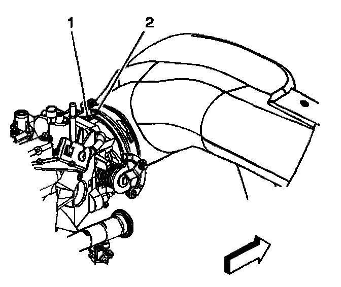 8. Align the arrow (2) at the throttle body end of the duct with the throttle body attaching stud (1).