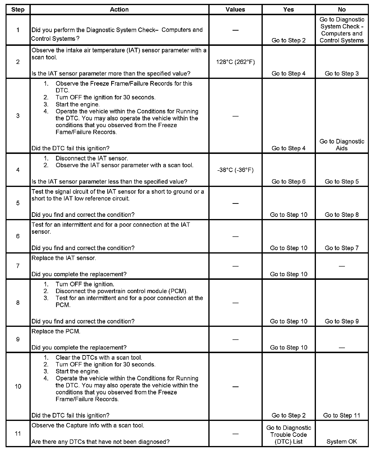 The intake air temperature (IAT) sensor is a variable resistor. The IAT sensor has a signal circuit and a low reference circuit. The IAT sensor measures the temperature of the air entering the engine. The powertrain control module (PCM) supplies 5 volts to the IAT signal circuit and a ground for the IAT low reference circuit. When the IAT sensor is cold, the sensor resistance is high. When the air temperature increases, the sensor resistance decreases. With high sensor resistance, the PCM detects a high voltage on the IAT signal circuit. With lower sensor resistance, the PCM detects a lower voltage on the IAT signal circuit. If the PCM detects an excessively low IAT signal voltage, indicating a high temperature, DTC P0112 sets.