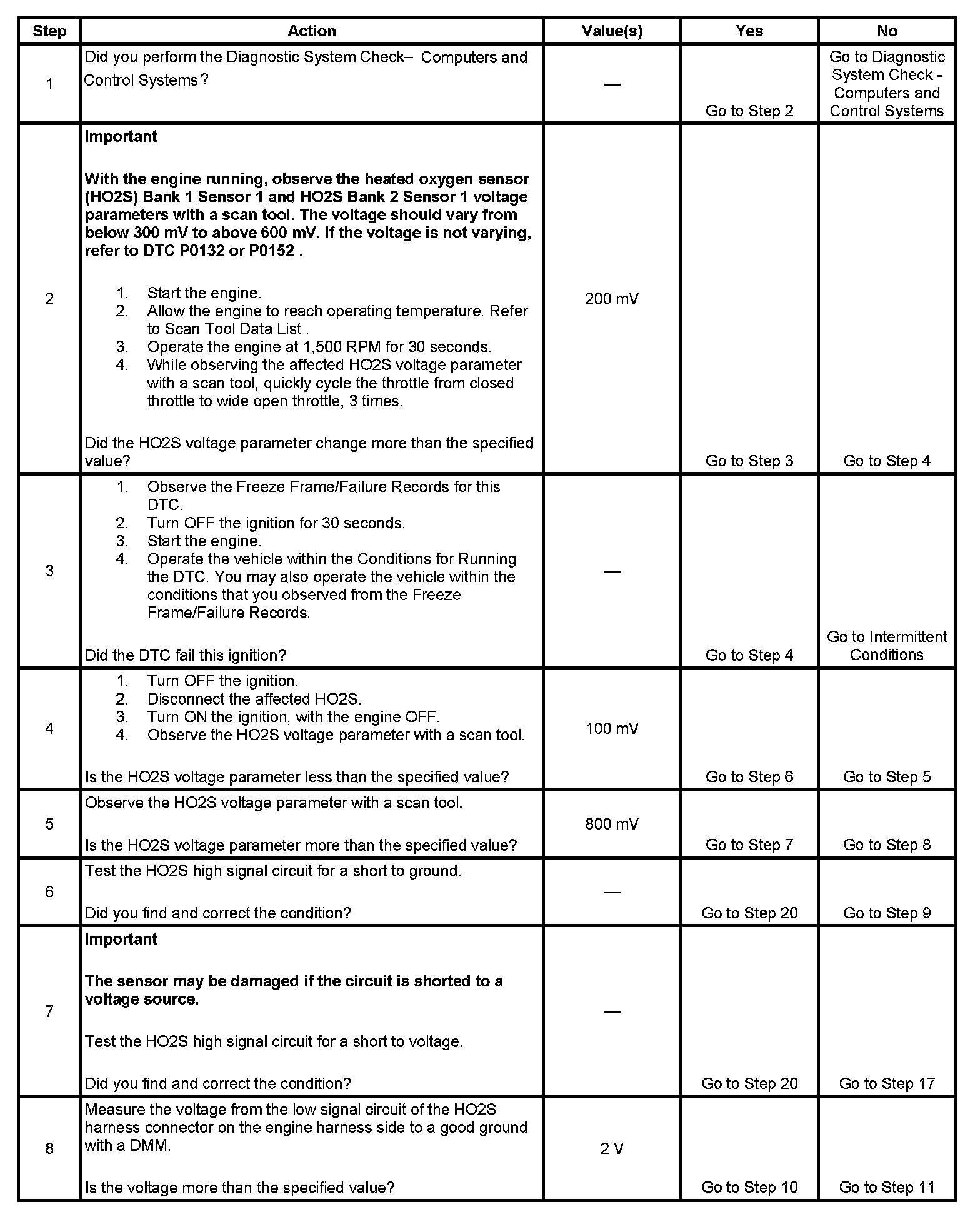 Heated oxygen sensors (HO2S) are used for fuel control and post catalyst monitoring. Each HO2S compares the oxygen content of the surrounding air with the oxygen content in the exhaust stream. The HO2S must reach operating temperature to provide an accurate voltage signal. Heating elements inside the HO2S minimize the time required for the sensors to reach operating temperature. The powertrain control module (PCM) supplies the HO2S with a reference, or bias, voltage of about 450 mV. When the engine is first started the PCM operates in open loop, ignoring the HO2S voltage signal. Once the HO2S reaches operating temperature and closed loop is achieved, the HO2S generates a voltage within a range of 0-1,000 mV that fluctuates above and below bias voltage. High HO2S voltage indicates a rich exhaust stream; low HO2S voltage indicates a lean exhaust stream. If the PCM detects an HO2S voltage that stays below a specified value, DTC P0137 sets for HO2S bank 1 sensor 2 or DTC P0157 sets for HO2S bank 2 sensor 2.