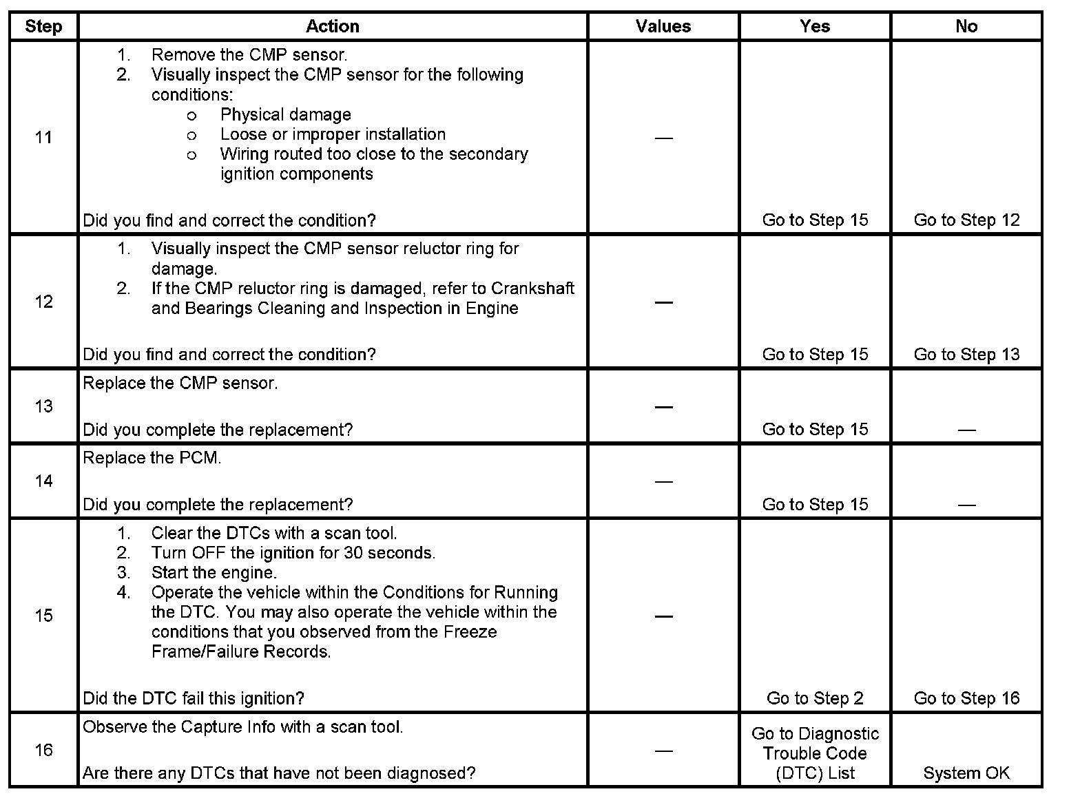 The CMP sensor 1 X signal is used by the PCM to determine if the cylinder at top dead center (TDC) is on the firing stroke or the exhaust stroke. The PCM can determine TDC for all cylinders by using the CKP sensor 24 X signal alone. The engine will start without a CMP signal as long as the PCM receives the CKP sensor 24 X signal. A slightly longer cranking time may be a symptom of this condition. The system attempts synchronization and looks for an increase in engine speed indicating that the engine started. If the PCM does not detect an increase in engine speed, the PCM assumes that the PCM incorrectly synchronized to the exhaust stroke and re-syncs to the opposite cam position. If the PCM detects that the CMP signal is constantly high, DTC P0343 sets.