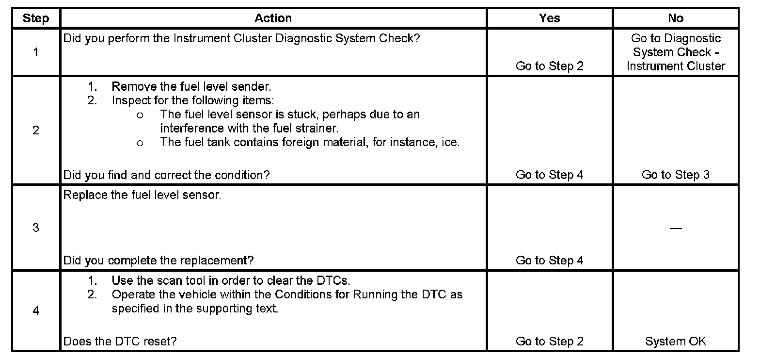 The fuel level sensor changes resistance in response to the fuel level. The powertrain control module (PCM) monitors the signal circuit of the fuel level sensor in order to determine the fuel level. When the fuel tank is full, the sensor resistance is low and the PCM senses a low signal voltage. When the fuel tank is empty, the sensor resistance is high and the PCM senses a high signal voltage. The PCM uses the signal circuit of the fuel level sensor in order to calculate the percentage of remaining fuel in the tank. The PCM sends the fuel level percentage via the class 2 serial data circuit to the instrument cluster in order to control the fuel gage. The fuel level information is also used for misfire and evaporative emission (EVAP) diagnostics.