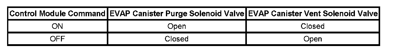 The table illustrates the relationship between the ON and OFF states, and the Open or Closed states of the EVAP canister purge and vent solenoid valves.