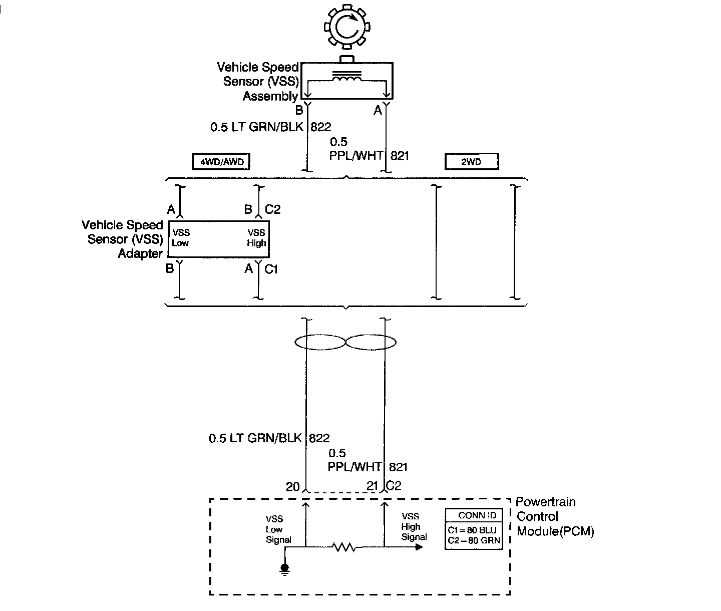 The vehicle speed sensor (VSS) assembly provides vehicle speed information to the powertrain control module (PCM). The VSS assembly is a permanent magnet generator. The VSS produces an AC voltage as rotor teeth on the output shaft of the transmission, 2WD, or transfer case, 4WD/AWD, pass through the sensor's magnetic field. The AC voltage level and the number of pulses increase as the speed of the vehicle increases. The PCM converts the pulsing voltage to vehicle speed. The PCM uses the vehicle speed signal to determine shift timing and torque converter clutch (TCC) scheduling.