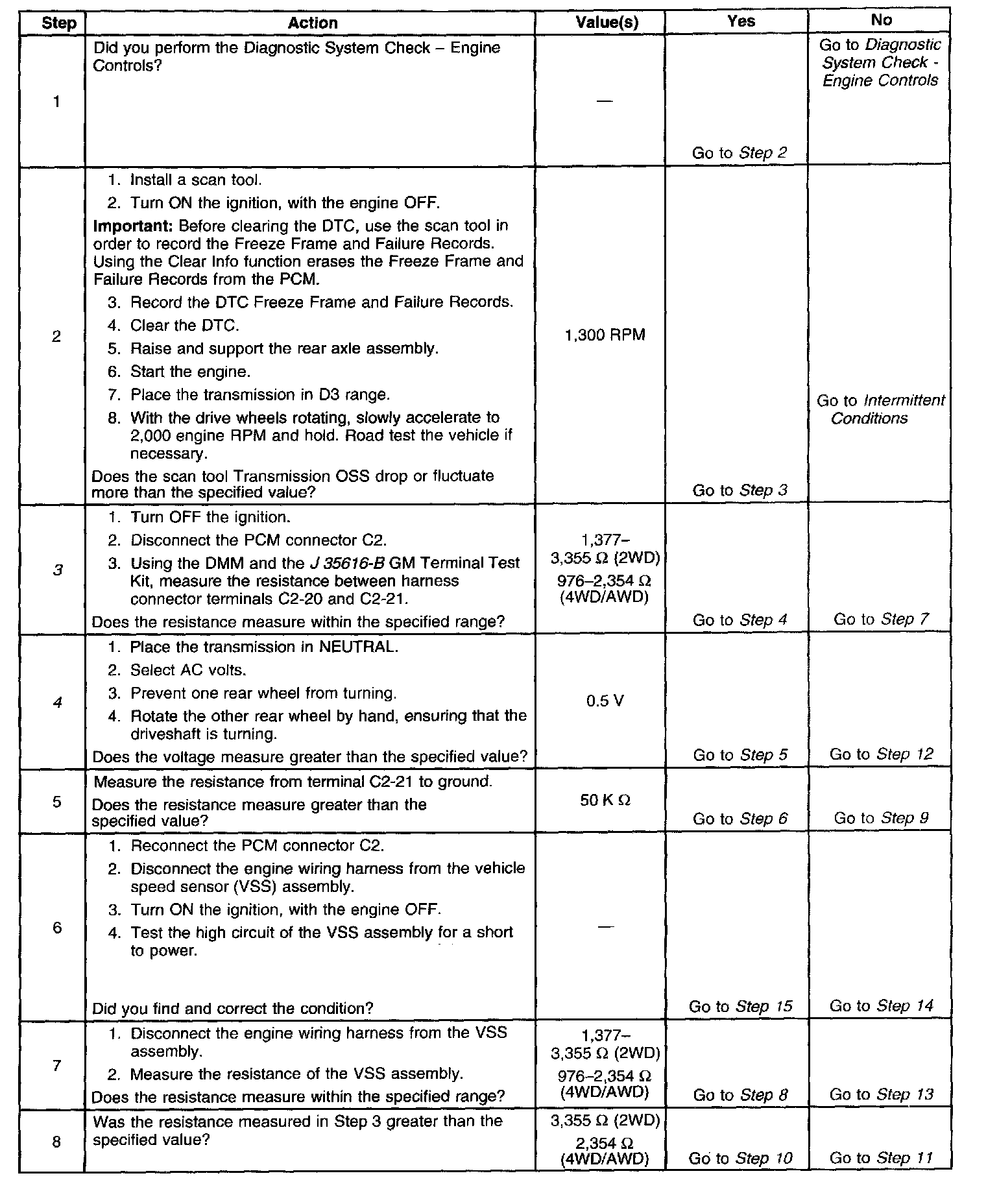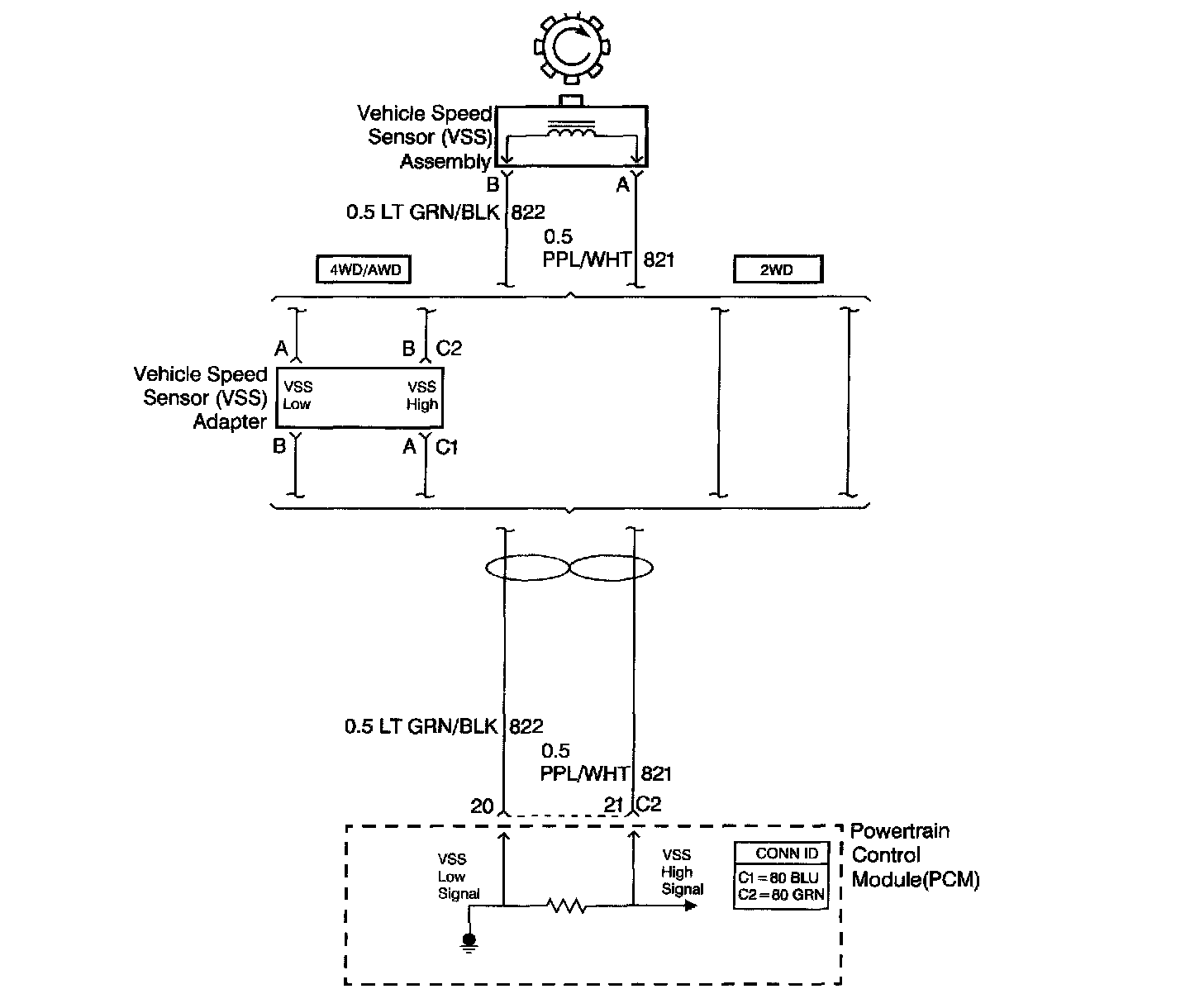 The vehicle speed sensor (VSS) assembly provides vehicle speed information to the powertrain control module (PCM). The VSS assembly is a permanent magnet generator. The VSS produces an AC voltage as rotor teeth on the output shaft of the transmission, 2WD, or transfer case, 4WD/AWD, pass through the sensor's magnetic field. The AC voltage level and the number of pulses increase as the speed of the vehicle increases. The PCM converts the pulsing voltage to vehicle speed. The PCM uses the vehicle speed signal to determine shift timing and torque converter clutch (TCC) scheduling.