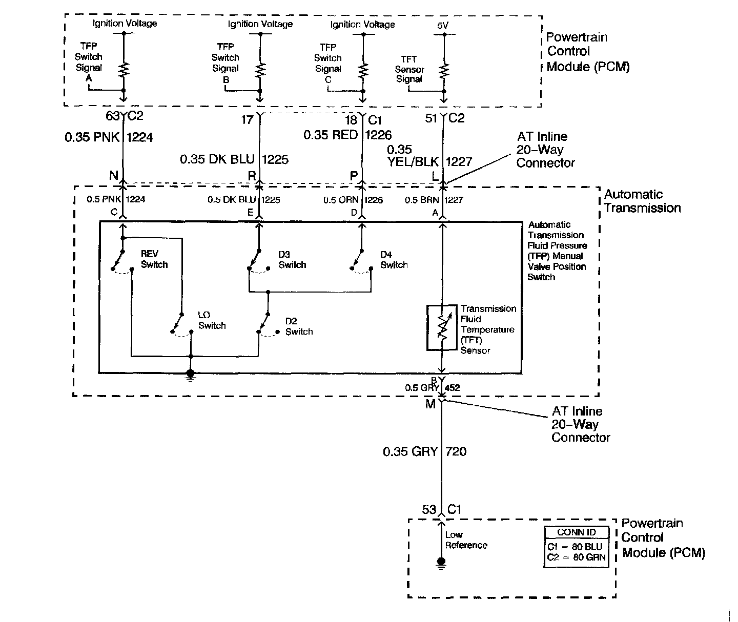 The automatic transmission fluid temperature (TFT) sensor is part of the automatic transmission fluid pressure (TFP) manual valve position switch. The TFT sensor is a resistor, or thermistor, which changes value based on temperature. The sensor has a negative-temperature coefficient. This means that as the temperature increases, the resistance decreases, and as the temperature decreases, the resistance increases. The powertrain control module (PCM) supplies a 5-volt reference signal to the sensor on the TFT sensor signal circuit and measures the voltage drop in the circuit. When the transmission fluid is cold, the sensor resistance is high and the PCM detects high signal voltage. As the fluid temperature warms to a normal operating temperature, the resistance becomes less and the signal voltage decreases. The PCM uses this information to control shift quality and torque converter clutch apply.