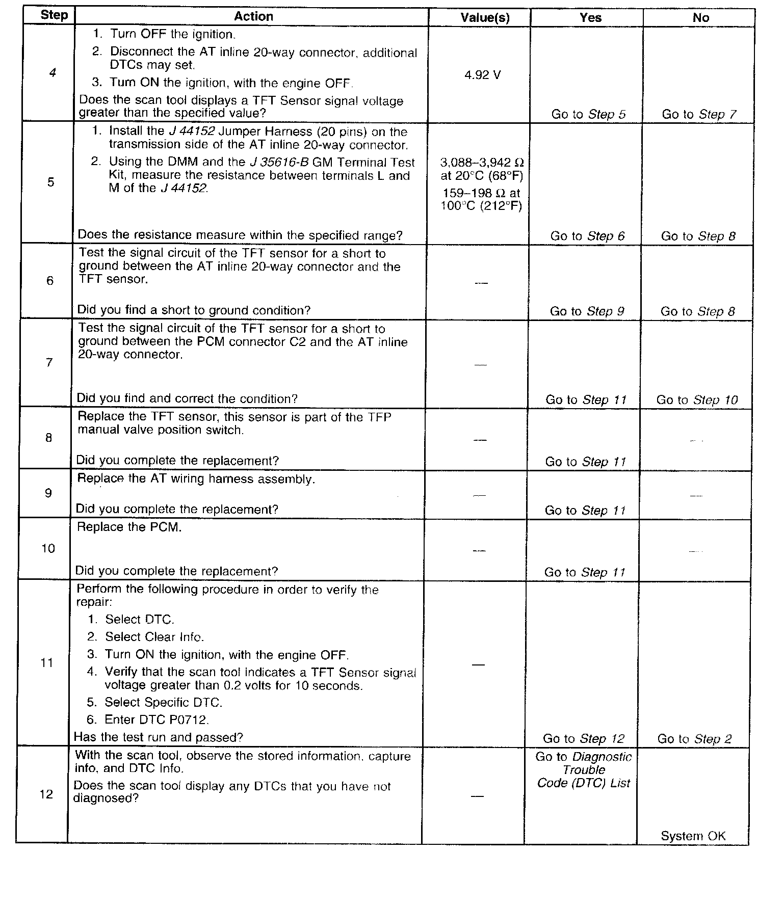 When the PCM detects a continuous short to ground in the TFT signal circuit or in the TFT sensor, then DTC P0712 sets. DTC P0712 is a type C DTC.