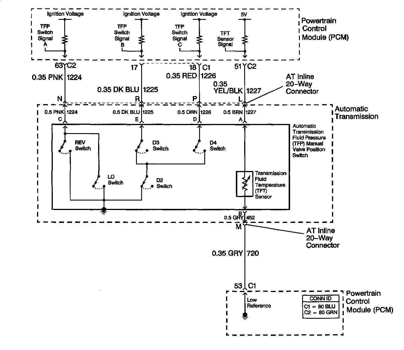 The automatic transmission fluid temperature (TFT) sensor is part of the automatic transmission fluid pressure (TFP) manual valve position switch. The TFT sensor is a resistor, or thermistor, which changes value based on temperature. The sensor has a negative-temperature coefficient. This means that as the temperature increases, the resistance decreases, and as the temperature decreases, the resistance increases. The powertrain control module (PCM) supplies a 5-volt reference signal to the sensor on the TFT sensor signal circuit and measures the voltage drop in the circuit. When the transmission fluid is cold, the sensor resistance is high and the PCM detects high signal voltage. As the fluid temperature warms to a normal operating temperature, the resistance becomes less and the signal voltage decreases. The PCM uses this information to control shift quality and torque converter clutch apply.