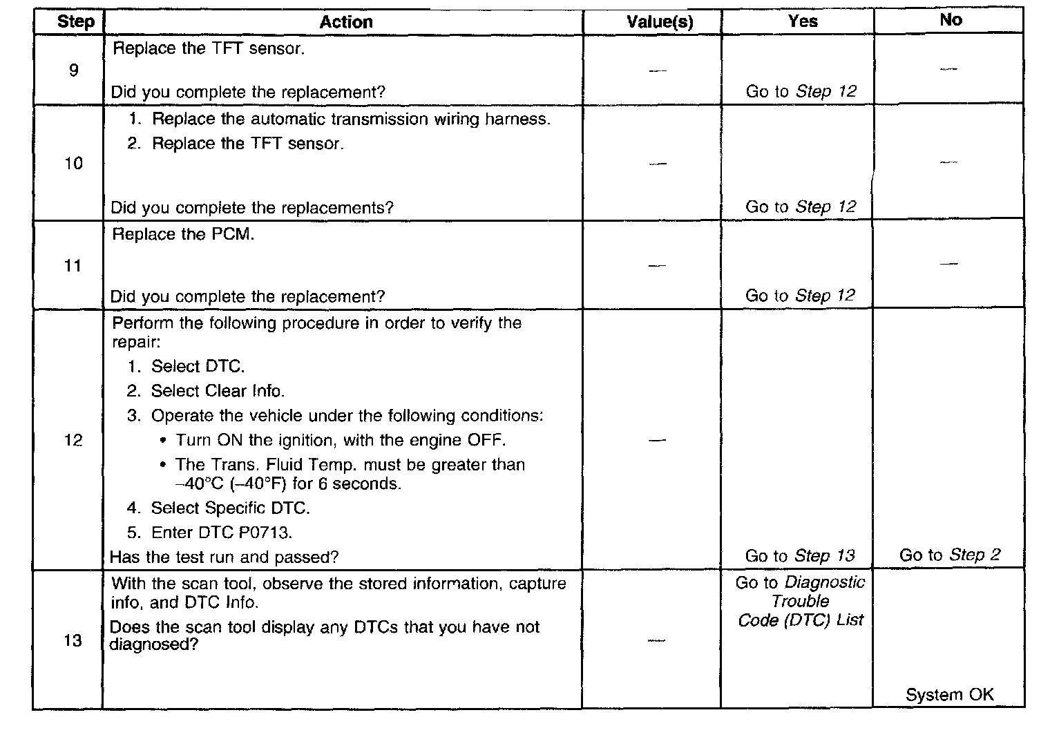 5. This step tests the TFT sensor signal circuit for being shorted to another circuit within the transmission. If the TFT sensor signal circuit shorts to another circuit, which is carrying voltage greater than five volts, the TFT sensor would become open.
