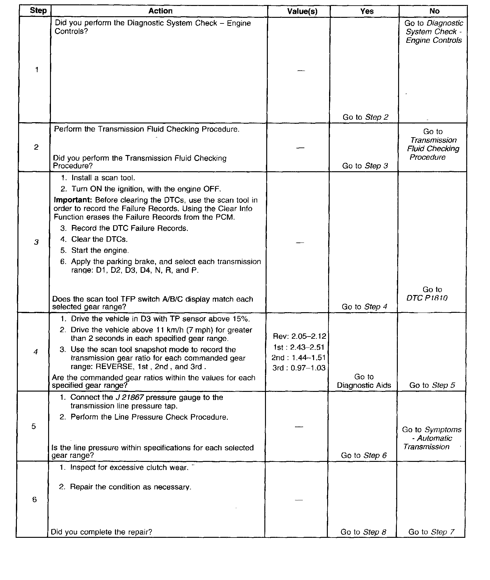 3. This step tests the indicated range signal to the actual selected range. A faulty TFP manual valve position switch could set DTC P1810.