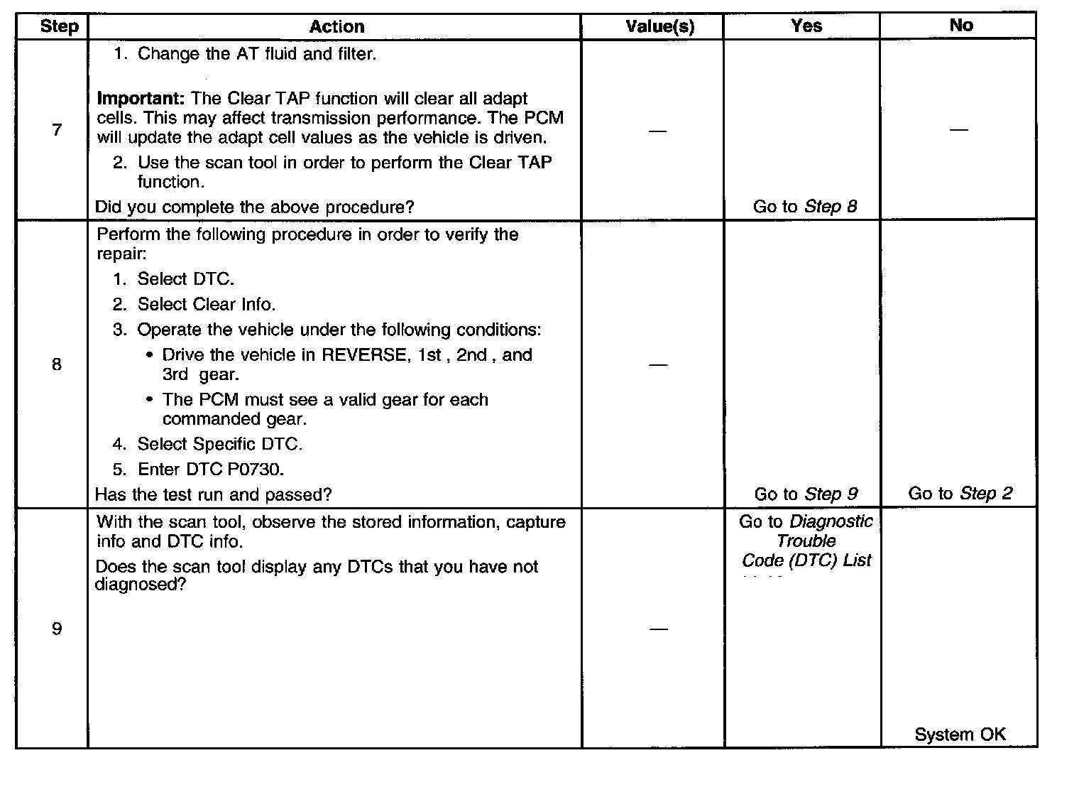 ^ DTC P0730 defaults to an elevated line pressure condition which may result in partial TCC apply. This may produce an idle surge that could stall the engine.