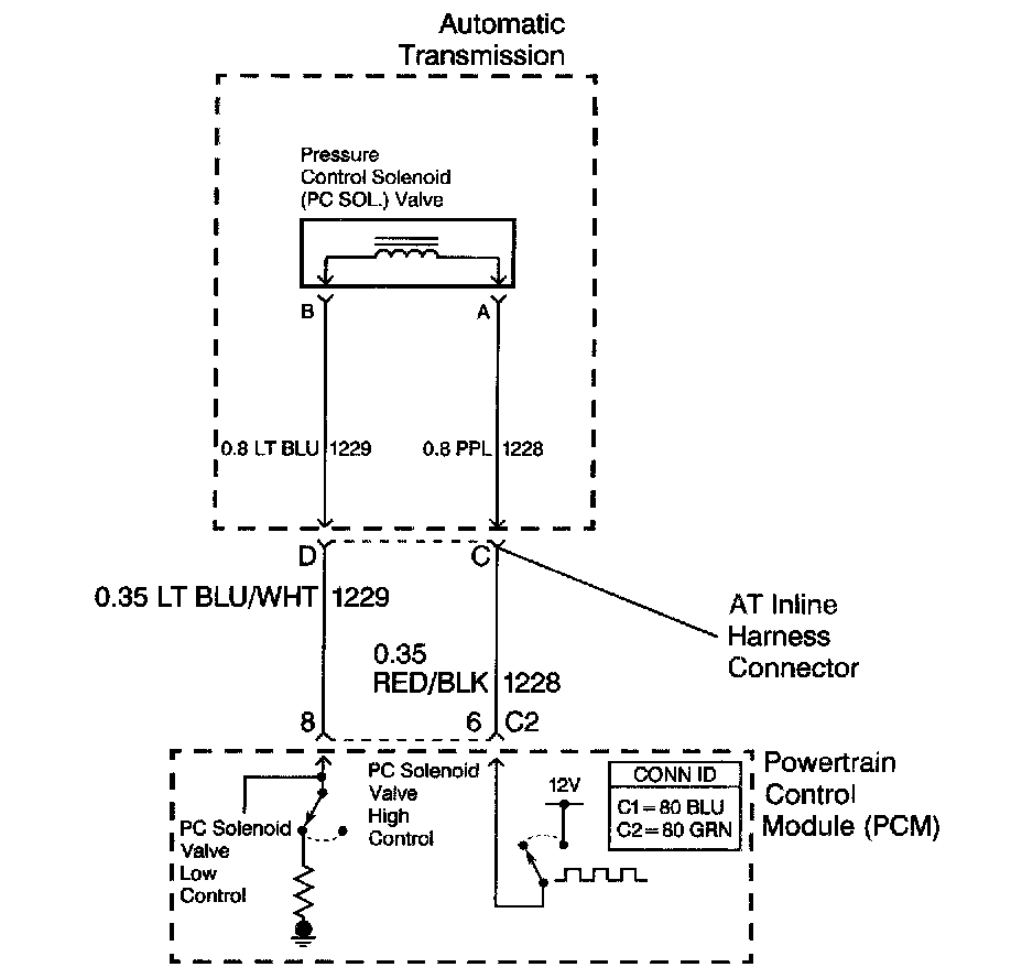 The pressure control (PC) solenoid valve is a powertrain control module (PCM) controlled device that regulates the transmission fine pressure. The PCM compares throttle position (TP) sensor voltage, engine RPM, and other inputs in order to determine the appropriate line pressure for a given load. The PCM regulates line pressure by applying a varying duty cycle to the PC solenoid valve based on the resistance of the solenoid, and the amperage needed to obtain optimum line pressure. The applied amperage varies from 0.1 amps for maximum line pressure to 1.1 amps for minimum line pressure.