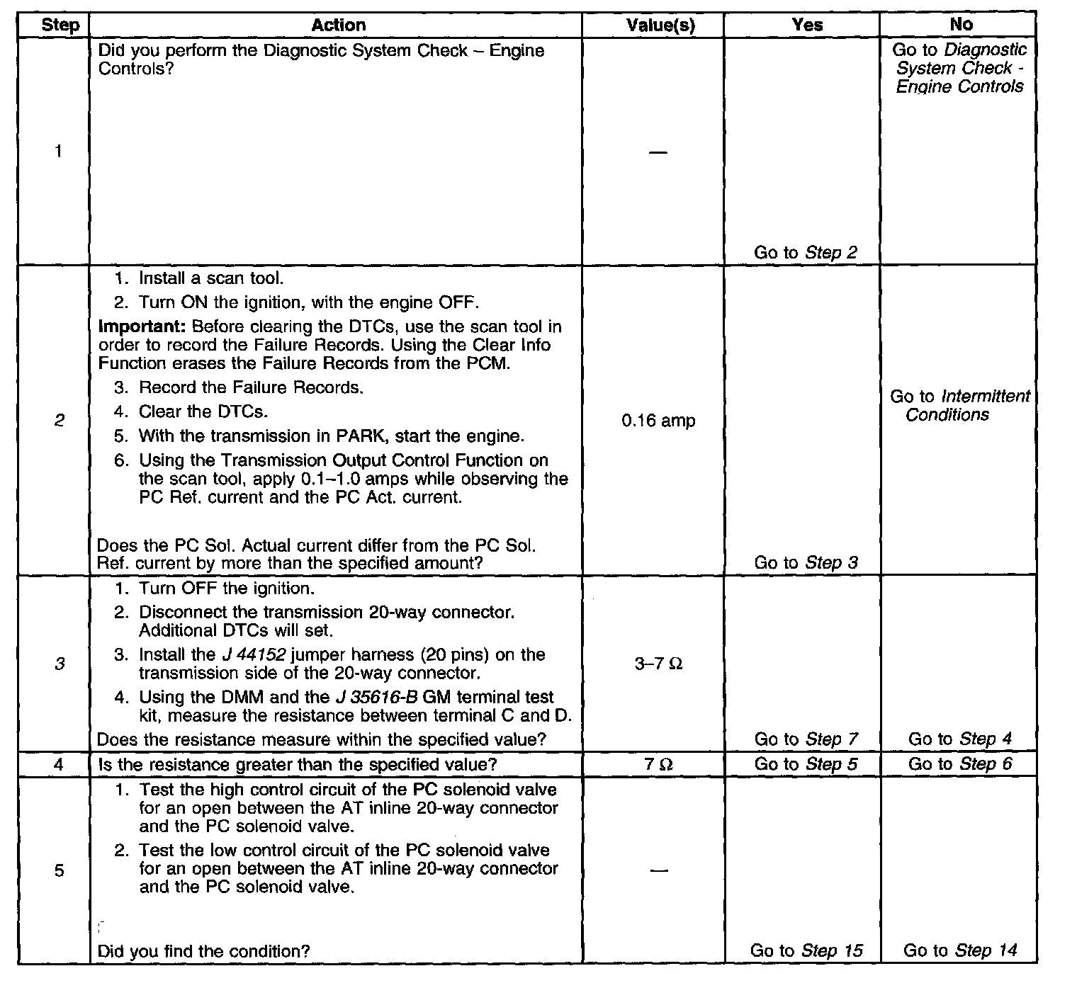 3. This step tests the PC solenoid valve and the AT wiring harness assembly for correct resistance.
