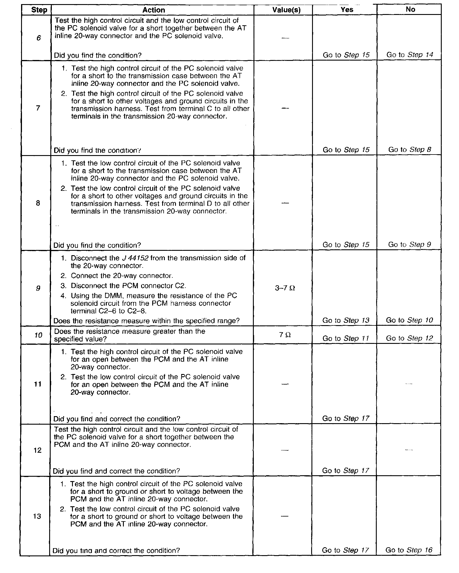 10. This step tests for a short to ground in the PC solenoid valve high control, solenoid A, circuit and the PC solenoid valve low control, solenoid A, circuit, of the engine harness.