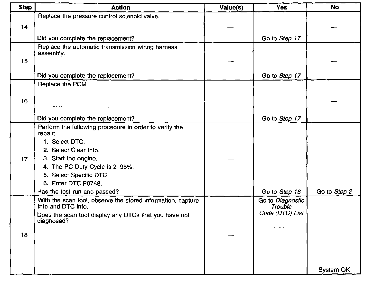 If the PCM detects a PC duty cycle that exceeds 95 percent or less than 0.5 percent, DTC P0748 sets DTC P0748 is a type C DTC.