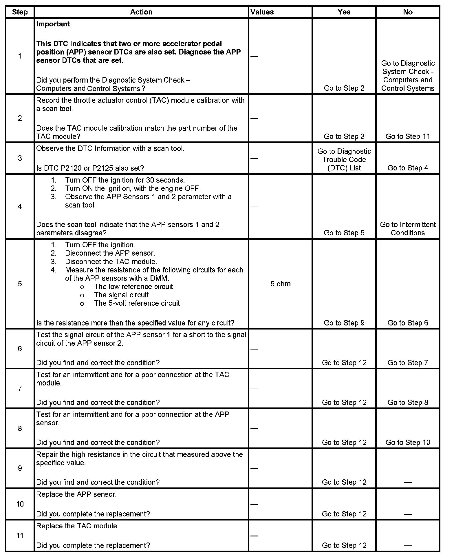 If only one APP sensor DTC is set, the redundant APP systems allow the TAC system to continue operating normally. This DTC sets if the powertrain control module (PCM) detects a condition with more than one APP sensor. One APP sensor DTC will not cause the Reduced Engine Power message to be displayed. Two APP sensor DTCs for the same sensor also will not cause the Reduced Engine Power message to be displayed. However, if two or more DTCs are set involving more than one APP sensor, this DTC will set and the Reduced Engine Power message is displayed.