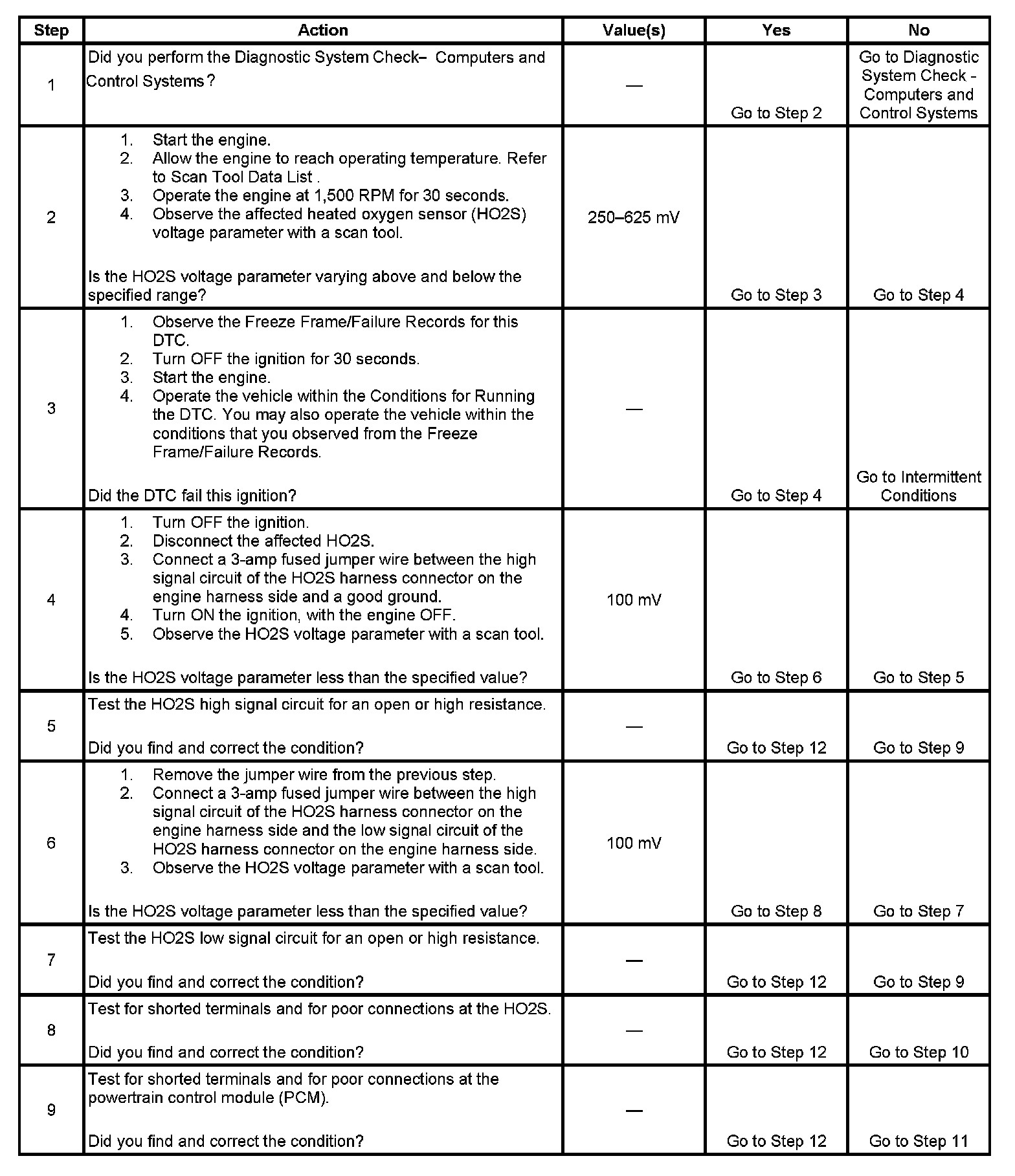 Heated oxygen sensors (HO2S) are used for fuel control and post catalyst monitoring. Each HO2S compares the oxygen content of the surrounding air with the oxygen content in the exhaust stream. The HO2S must reach operating temperature to provide an accurate voltage signal. Heating elements inside the HO2S minimize the time required for the sensors to reach operating temperature. The powertrain control module (PCM) supplies the HO2S with a reference, or bias, voltage of about 450 mV. When the engine is first started the PCM operates in open loop, ignoring the HO2S voltage signal. Once the HO2S reaches operating temperature and closed loop is achieved, the HO2S generates a voltage within a range of 0-1,000 mV that fluctuates above and below bias voltage. High HO2S voltage indicates a rich exhaust stream; low HO2S voltage indicates a lean exhaust stream. This diagnostic will only run once per ignition cycle. The PCM monitors the rich-to-lean and lean-to-rich transition time. A transition is defined as, the HO2S voltage changes from above 625 mV to below 250 mV or from below 250 mV to above 625 mV. If the PCM detects that the difference between the rich-to-lean average transition time and lean-to-rich average transition time is more than a specified value, DTC P1134 sets for HO2S bank 1 sensor 1, or DTC P1154 sets for HO2S bank 2 sensor 1.