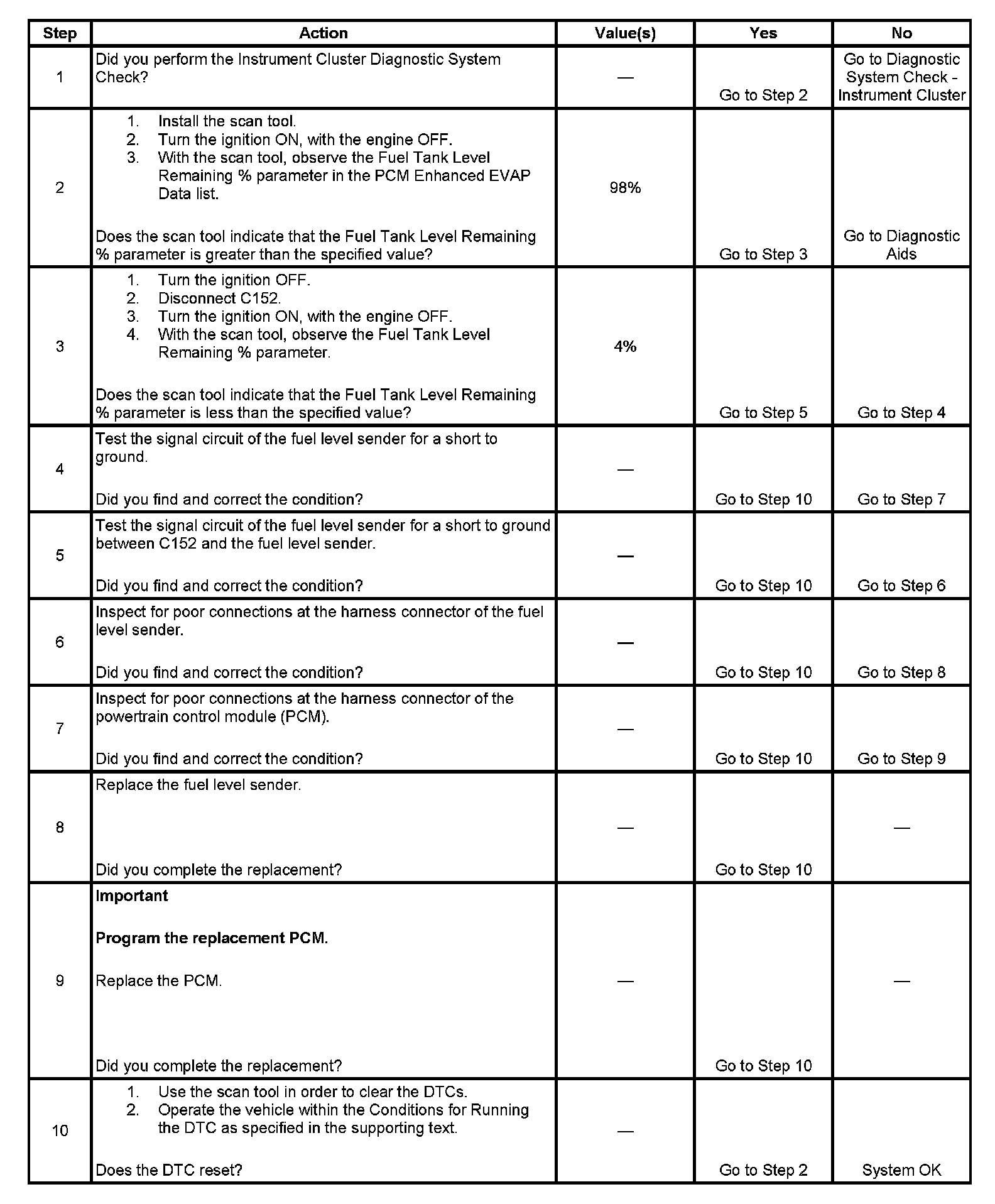 The number below refers to the step number on the diagnostic table.