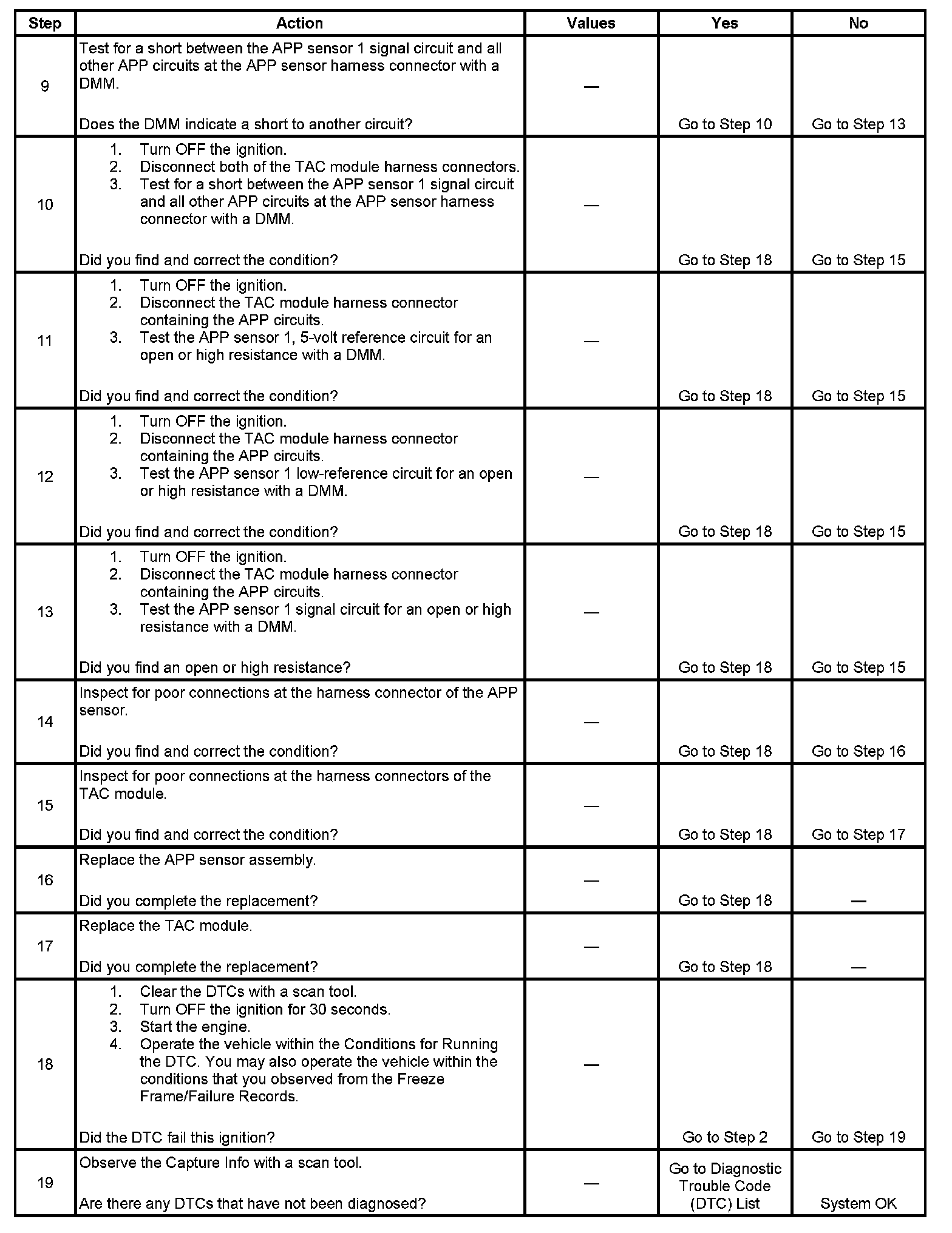5. This step isolates an internal APP sensor failure. The condition may only occur at a certain accelerator pedal position. Monitoring the APP angles for sensor 2 and sensor 3 is an accurate way of verifying the actual position of the pedal. The APP angles for all 3 sensors should be within a few percent of each other. If the pedal is at rest, the APP angle for all 3 sensors should be 0 percent. If the pedal is fully depressed, all APP angles should be 100 percent.