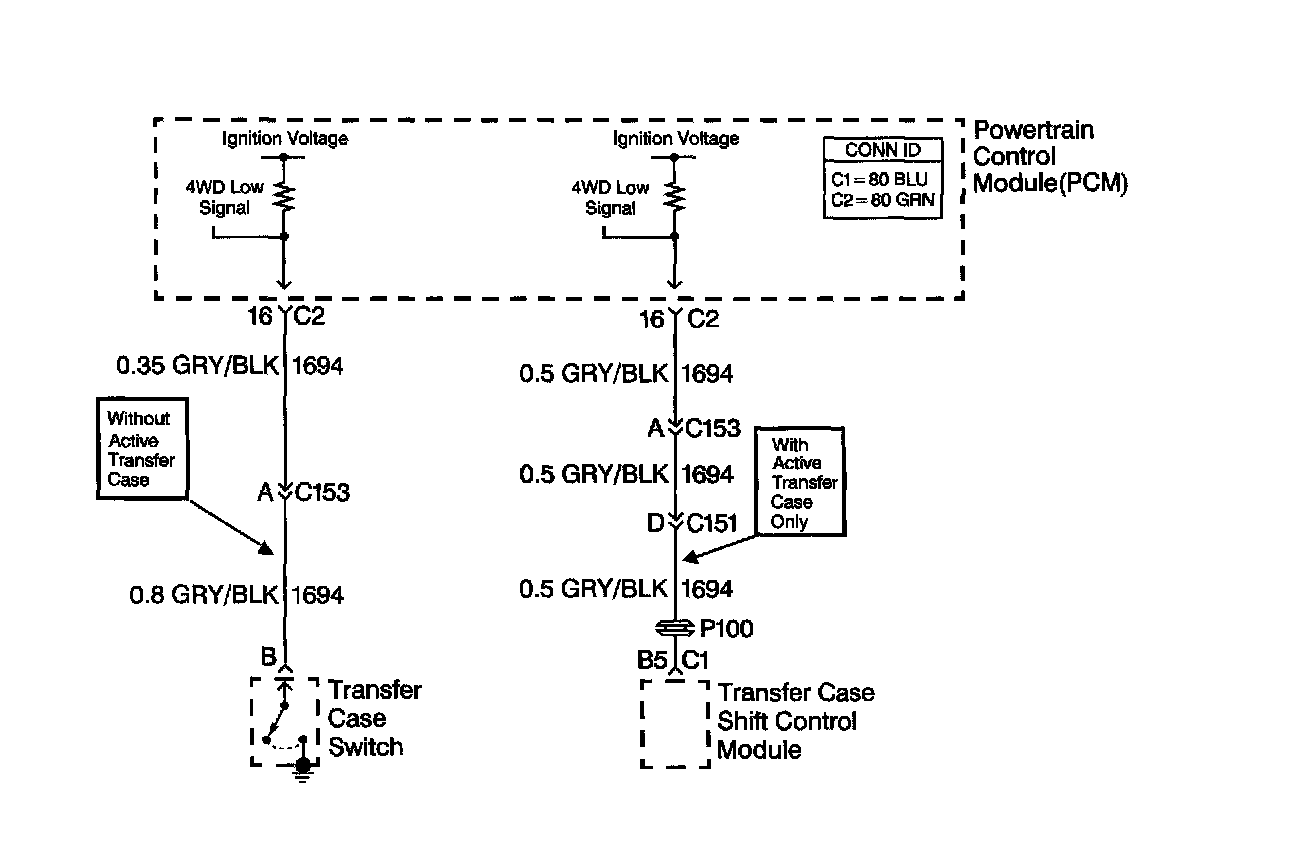 Vehicles not equipped with an active transfer case have a 4WD low circuit consisting of a PCM, transfer case switch and the circuit wiring. The transfer case switch is used to control the 4WD low signal circuit. When the operator moves the 4WD selector lever to 4WD low, the transfer case switch closes, and the 4WD low signal circuit changes from B+ voltage to zero volts. The PCM then compensates for transfer case gear reduction in the automatic transmission output shaft speed sensor (AT OSS) readings. The PCM uses the transmission VSS signal in order to adjust shift points, line pressure and TCC scheduling.