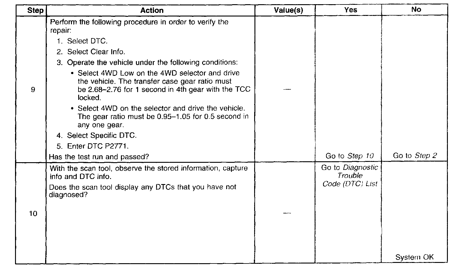 If the PCM detects a continuous open or short to ground in the 4WD low signal circuit, DTC P2771 sets. DTC P2771 is a type C DTC. For California emissions vehicles DTC P2771 is a type B DTC.