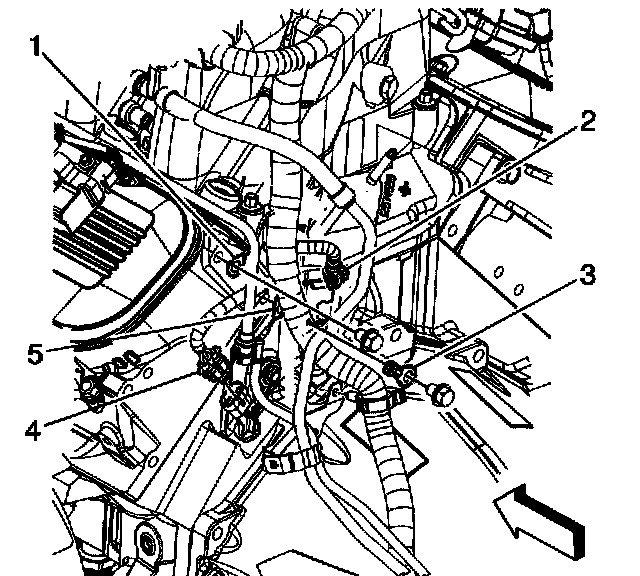 5. Reposition the engine harness grounds (1 and 5) and ground strap (4) from the cylinder head.