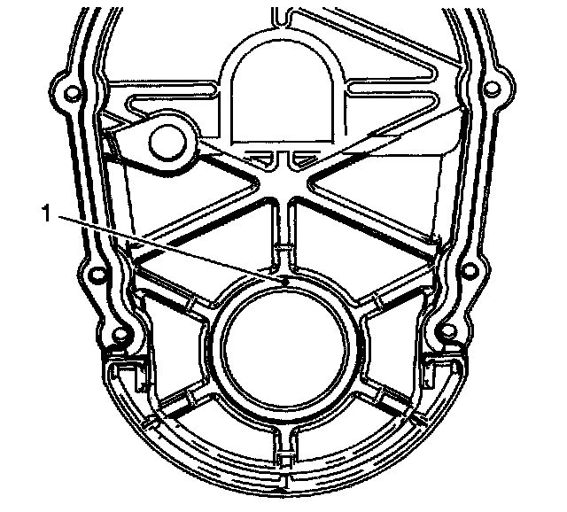 6. Apply a 3 - 4 mm (0.12 - 0.16 inch) bead of sealant GM P/N 12346286, (Canadian PIN 10953472), or equivalent in 2 sealant points (1) across the flange where the gasket ends at the bottom of the front cover.