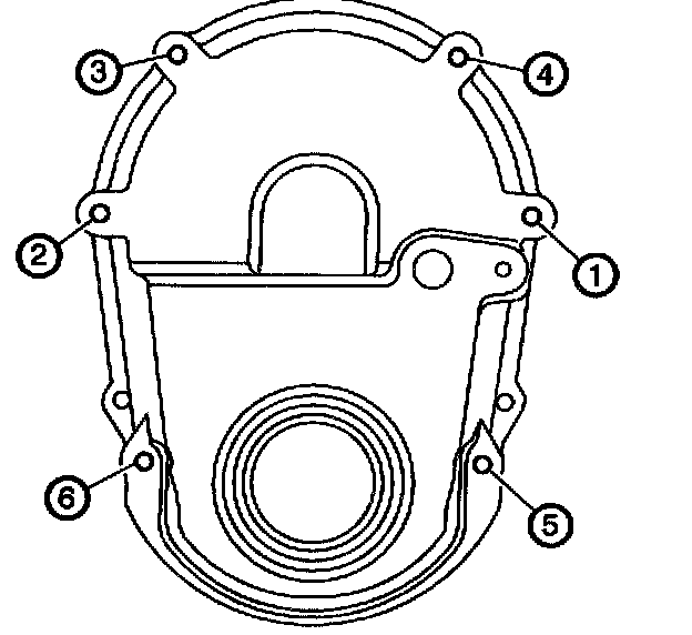 - Tighten the engine front cover bolts in sequence a first pass to 6 Nm (53 lb in).