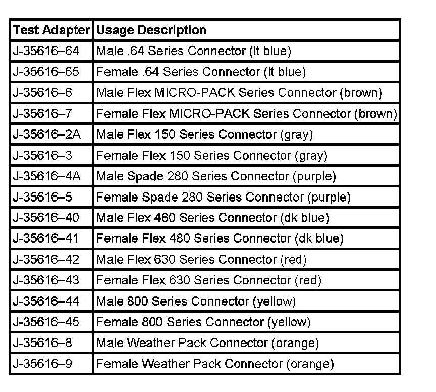 NOTE: Do not insert test equipment probes into any connector or fuse block terminal. The diameter of the test probes will deform most terminals. A deformed terminal can cause a poor connection, which can result in system failures. Always use the J 35616-B Connector Test Adapter Kit or the J 42675 Flat Wire Probe Adapter Kit in order to frontprobe terminals. Do not use paper clips or other substitutes as they can damage terminals and cause incorrect measurements.