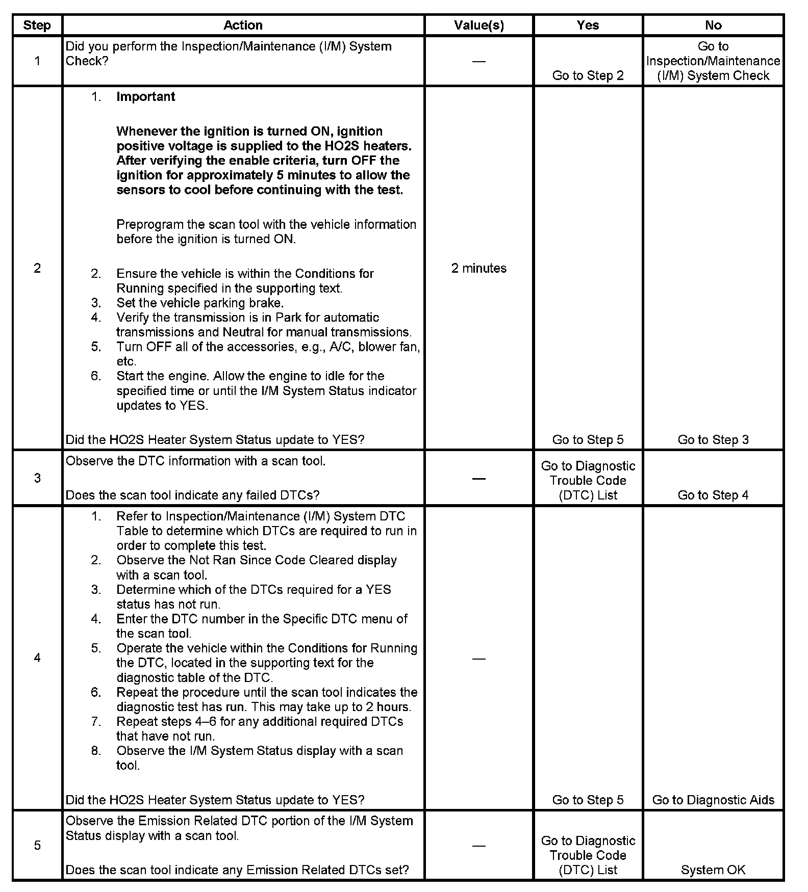 The purpose of this test is to satisfy the enable criteria necessary to execute I/M readiness diagnostics for the Heated Oxygen Sensor (HO2S) Heater System. The test may be used to set the I/M System Status to YES.