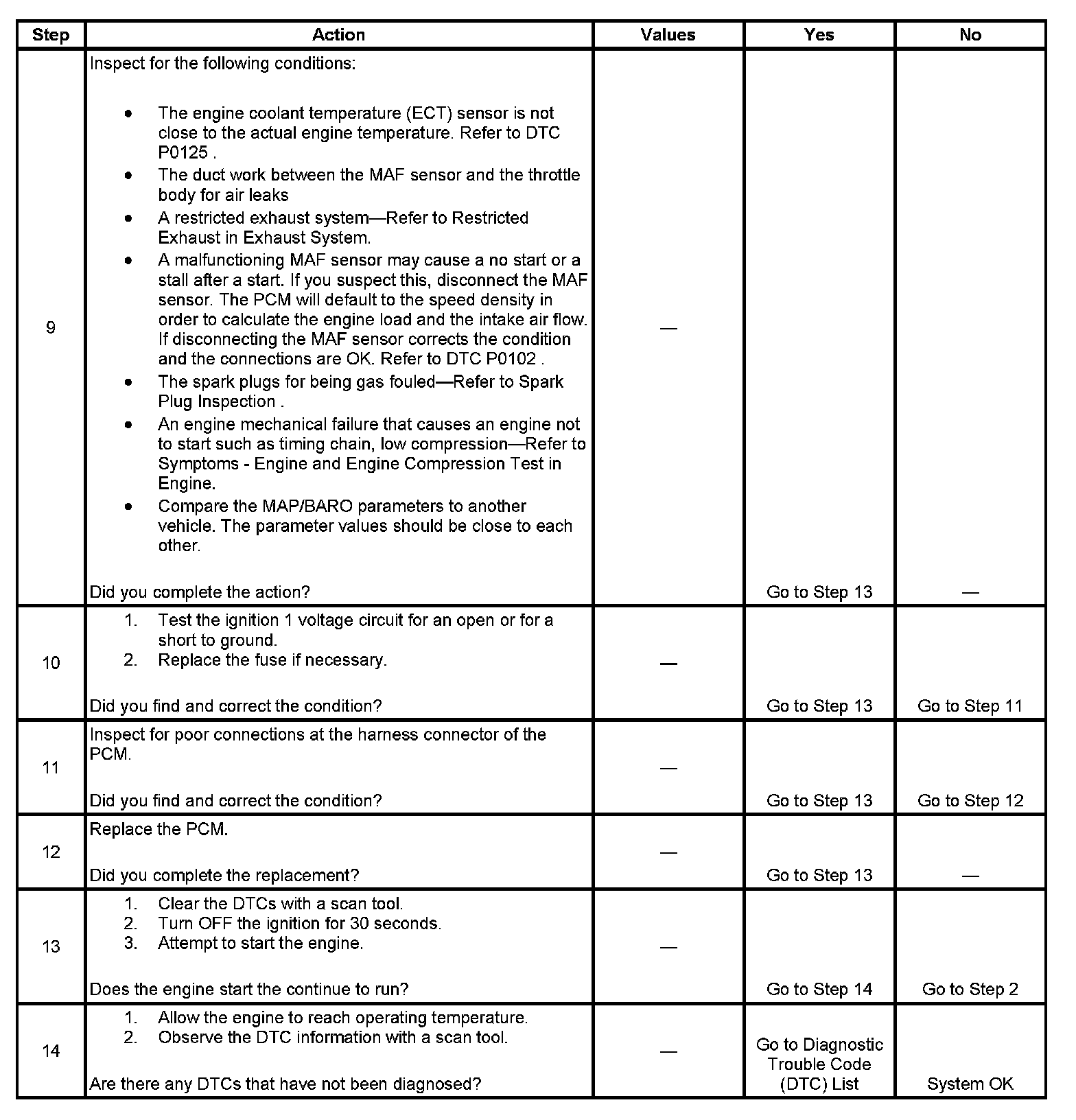The Engine Cranks but Does Not Run diagnostic table is an organized approach to identifying a condition that causes an engine to not start. The diagnostic table directs the service technician to the appropriate system diagnosis. The diagnostic table assumes the following conditions are met: