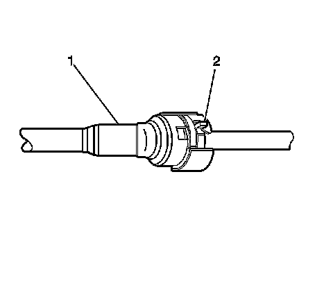 4. In order to disconnect the EVAP purge tube connector (1), slide the retaining tab (2) to the release position and separate the connection.