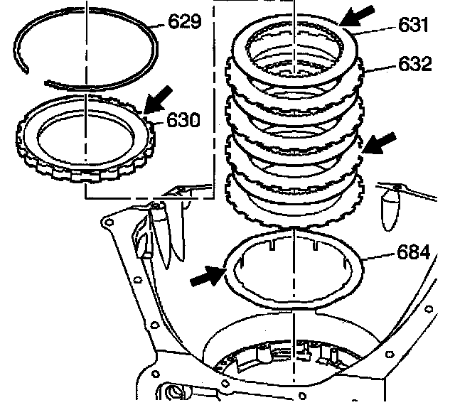 2. Remove the intermediate clutch backing plate (630) and the intermediate clutch plates (631, 632) (4 each).